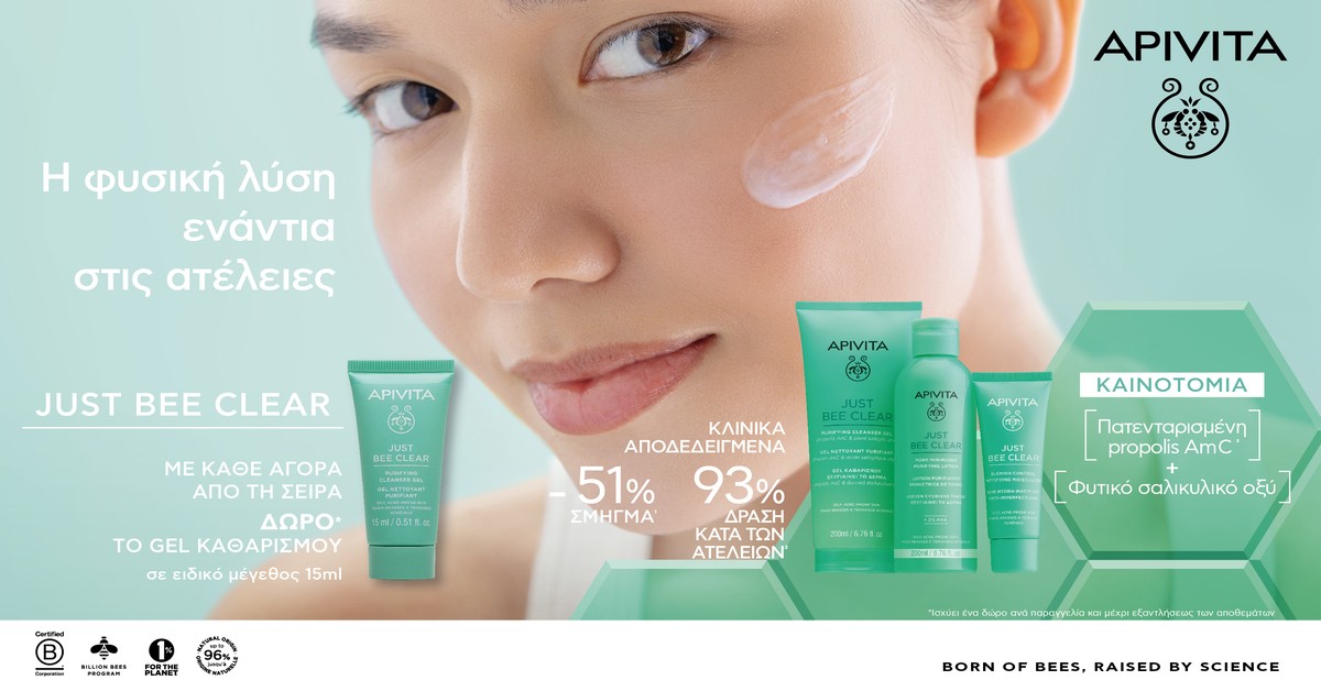 Apivita: Με κάθε αγορά προϊόντων Just Bee Clear Δώρο Το Gel Καθαρισμού 15ml